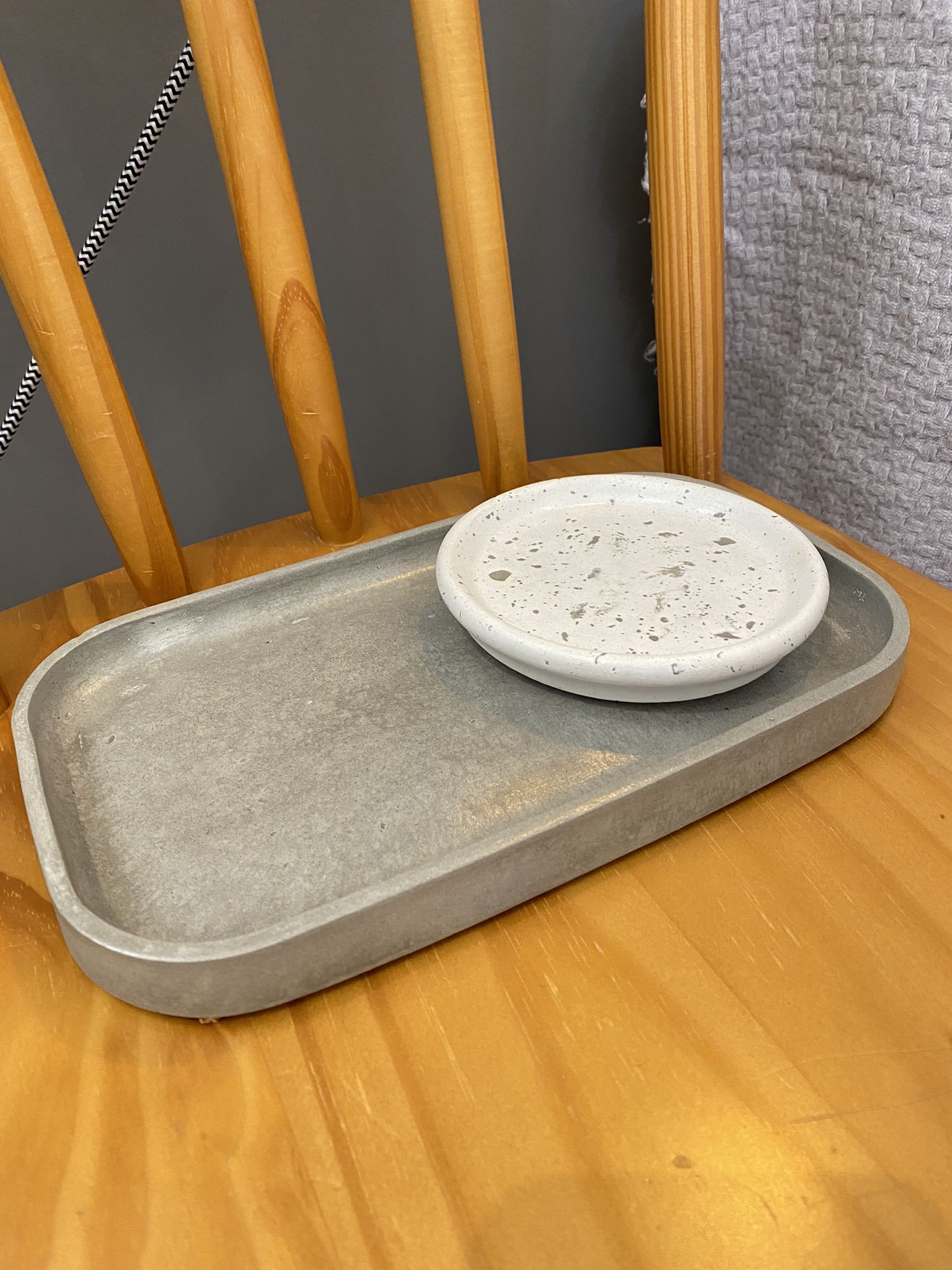 -Material: Confecionado em concreto. Especificações Bandeja Oval: 25 x 14 x 2 - Peso: 350g