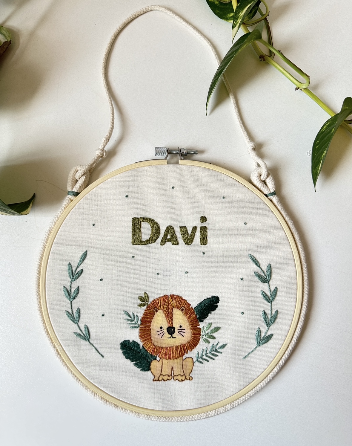 Bordado livre em bastidor de 20 cm, com acabamentos exclusivos nas laterais. Coloque o nome do bebê ou criança no bordado. Confeccionado de forma artesanal sob encomenda, todos detalhes customizados. Após finalizar o pedido, entrar em contato via WhatsApp para customizar todos os detalhes.