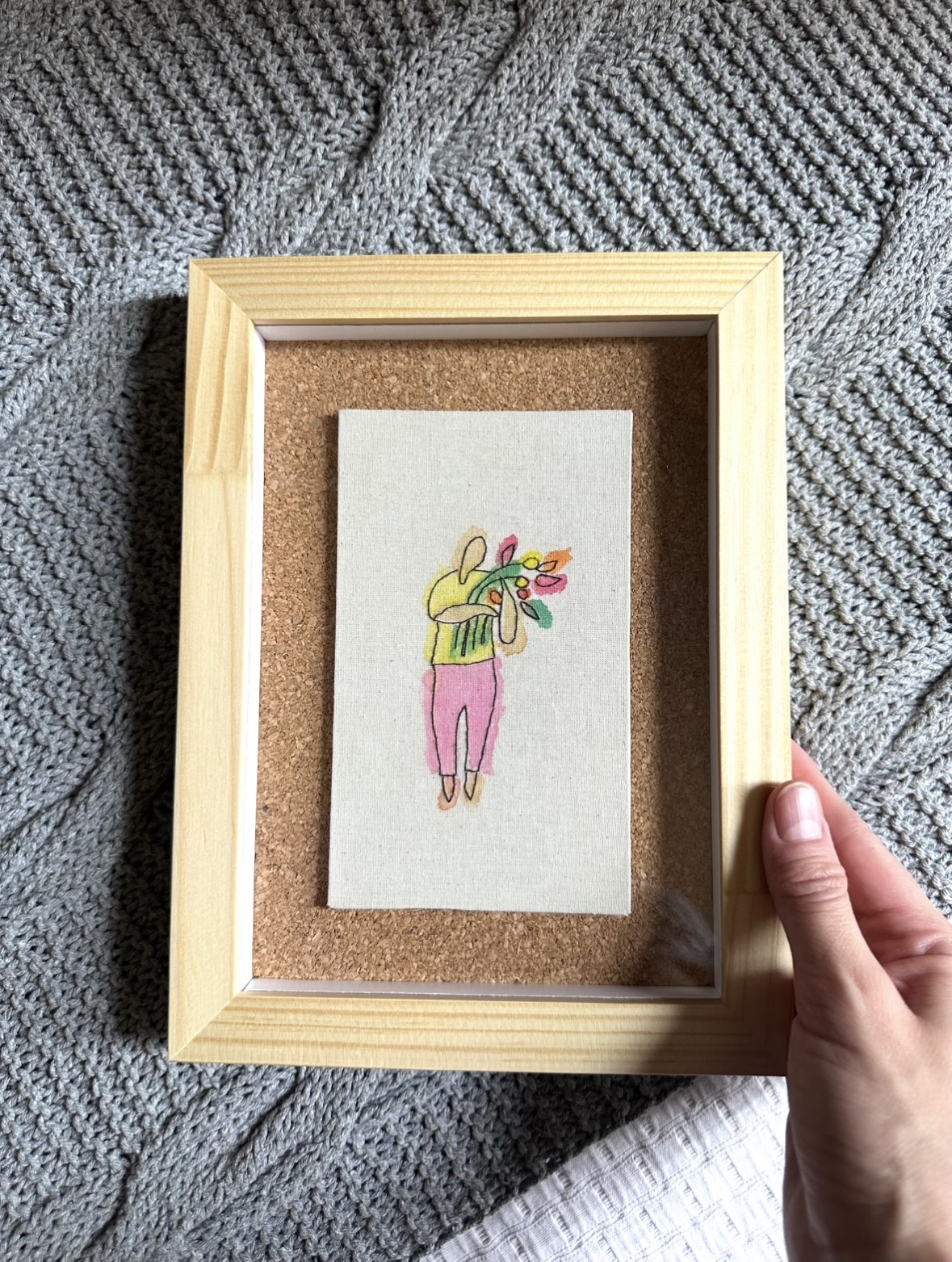 Descrição do produto: bordada em tecido de algodão cru sobre cartonado e com pinceladas de aquarela . Moldura em caixaria 24X18cm em madeira Pinus natural.